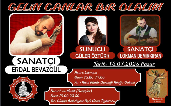 Dernekten yapılan açıklamaya göre, 13 Temmuz 2025 Pazar günü saat 15.00-17.00 arası dernek binasında aşure lokması dağıtımı yapılacak. Lokma ikramının ardından aynı gün saat 19.00-23.50 arasında Aliağa Belediyesi Açıkhava Tiyatrosu'nda semah gösterisi ve deyişlerden oluşan bir müzik dinletisi gerçekleştirilecek.