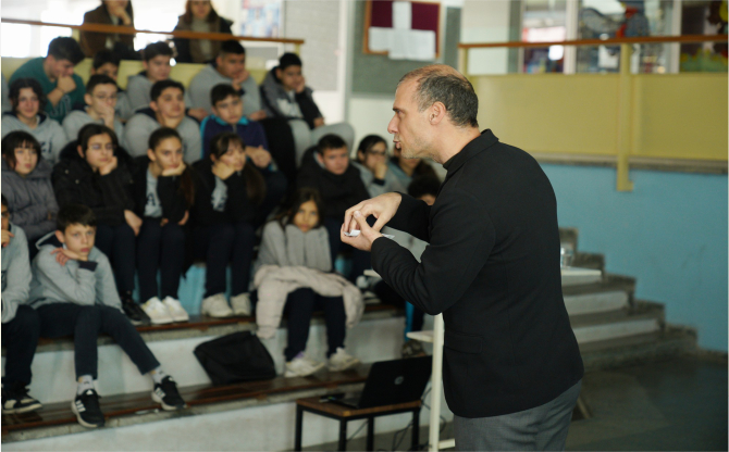 Aliağa Belediyesi İklim Değişikliği ve Sıfır Atık Müdürlüğü tarafından verilen seminerde birim müdürü çevre mühendisi Ozan Turan, öğrencilere sıfır atığın çevreye olan etkisi ve önemi hakkında bilgilendirmeler yaptı.