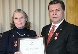 Kızılay İzmir Şubesi'nde düzenlenen ödül töreninde, Ege İhracatçı Birlikleri'nin gümüş madalyasını ve teşekkür belgesini EİB Koordinatör Başkanı Mustafa Türkmenoğlu adına EİB Genel Sekreter Yardımcısı Aziz Ercan Çelikli, Kızılay İzmir Şubesi Başkanı Prof. Dr. Aslı Özer'den aldı.